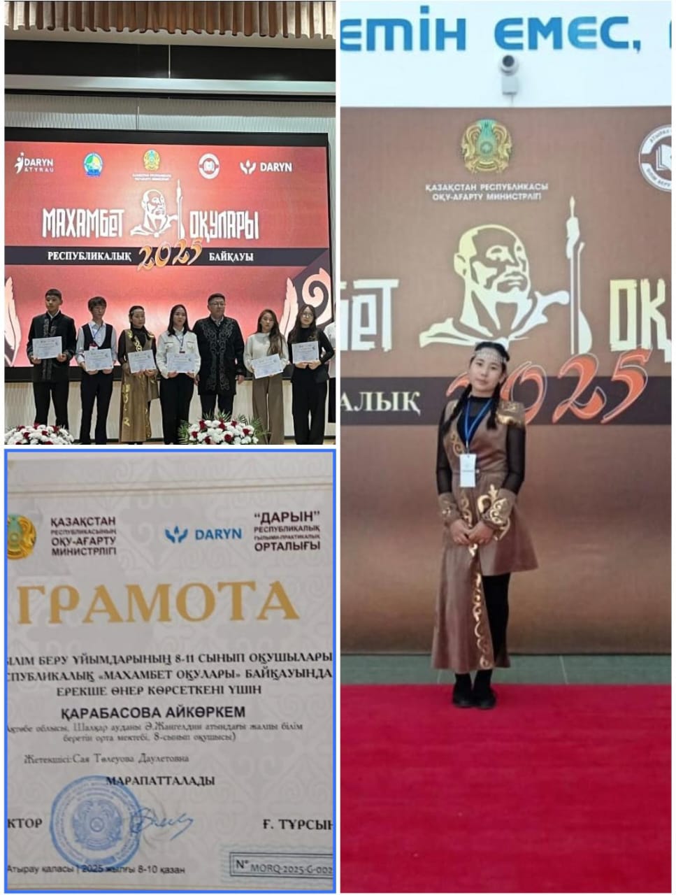 «Махамбет оқуларының» республикалық кезеңінде «Ел құтқарар ер едім…»бағыты бойынша Ақтөбе облысы атынан қатысқан «Ә.Жангелдин атындағы ЖОББМ» КММ-нің 9-сынып оқушысы Қарабасова Айкөркем Артурқызы ерекше өнер көрсеткені үшін «Грамота» иеленді.